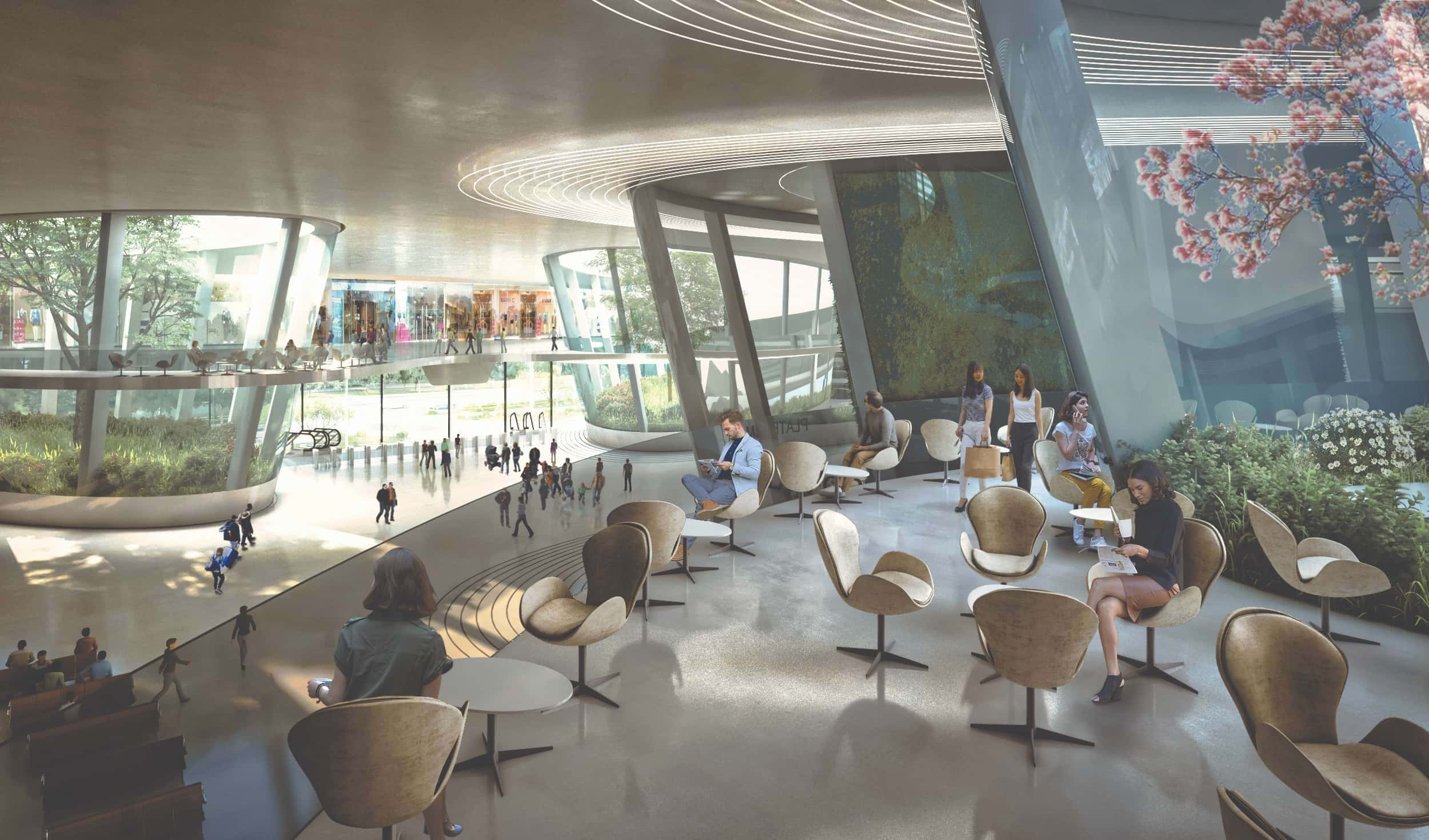 When passengers enter the station, the internal green garden welcomes them, aligning with the Garden City ideology. The concourse plaza is fully glazed, offering views for easy circulation, wayfinding, and maximum natural lighting. At the same time, the upper concourse is introverted, with surrounding shops, restaurants, and lounges opening to the circulation areas. The courtyards become the main focal point, with escalators and lifts nested within them, creating an integrated form-and-function relationship.