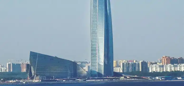 Before the start of the World Cup 2018 in Russia, the fitters from façade constructor Gartner − aided by roped industrial climbers − install the last of the 3 x 4 m glass panes at heights of over 300 m, without helicopter assistance. This oversized needle, with its curved glass façade , now stands majestically over the Gulf of Finland, welcoming approaching cruise ships from afar. Over 3,000 people were involved in the construction, with some 600 Russian and international companies. Over 20,000 people from 18 countries involved in the project’s full realization.