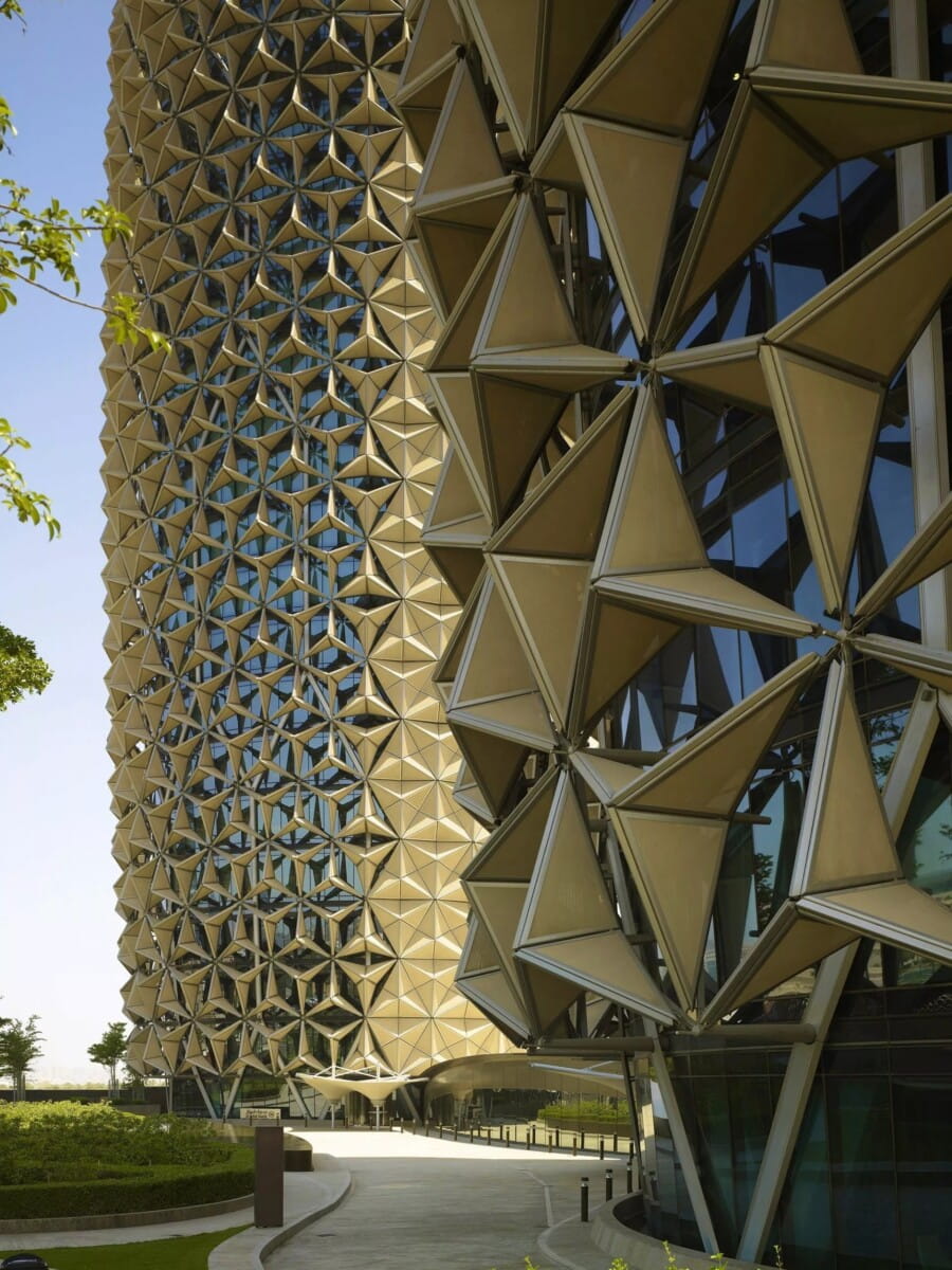 This iconic duo reimagines traditional Islamic mashrabiya screens with over 1,000 sun-responsive panels that open and close like origami, reducing solar heat gain by 50% in Abu Dhabi’s desert climate. Designed by Aedas Architects, the fibreglass composite triangles track sunlight via sensors, balancing shade and views while honouring cultural heritage.
