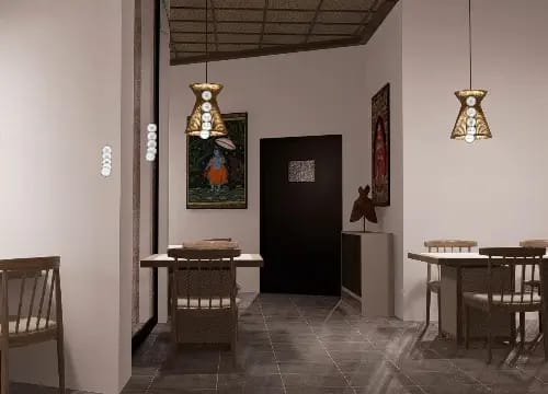 To further enhance the experience, we incorporate terracotta clay jaali in strategic areas to carefully control direct light incidence, ensuring a comfortable balance within the space. The sloped ceiling allows to place of solar panels directly on the ceiling to increase reliance on renewable resources. On the northern façade, big double-glazed glass panels allow for maximising the catchment of natural light