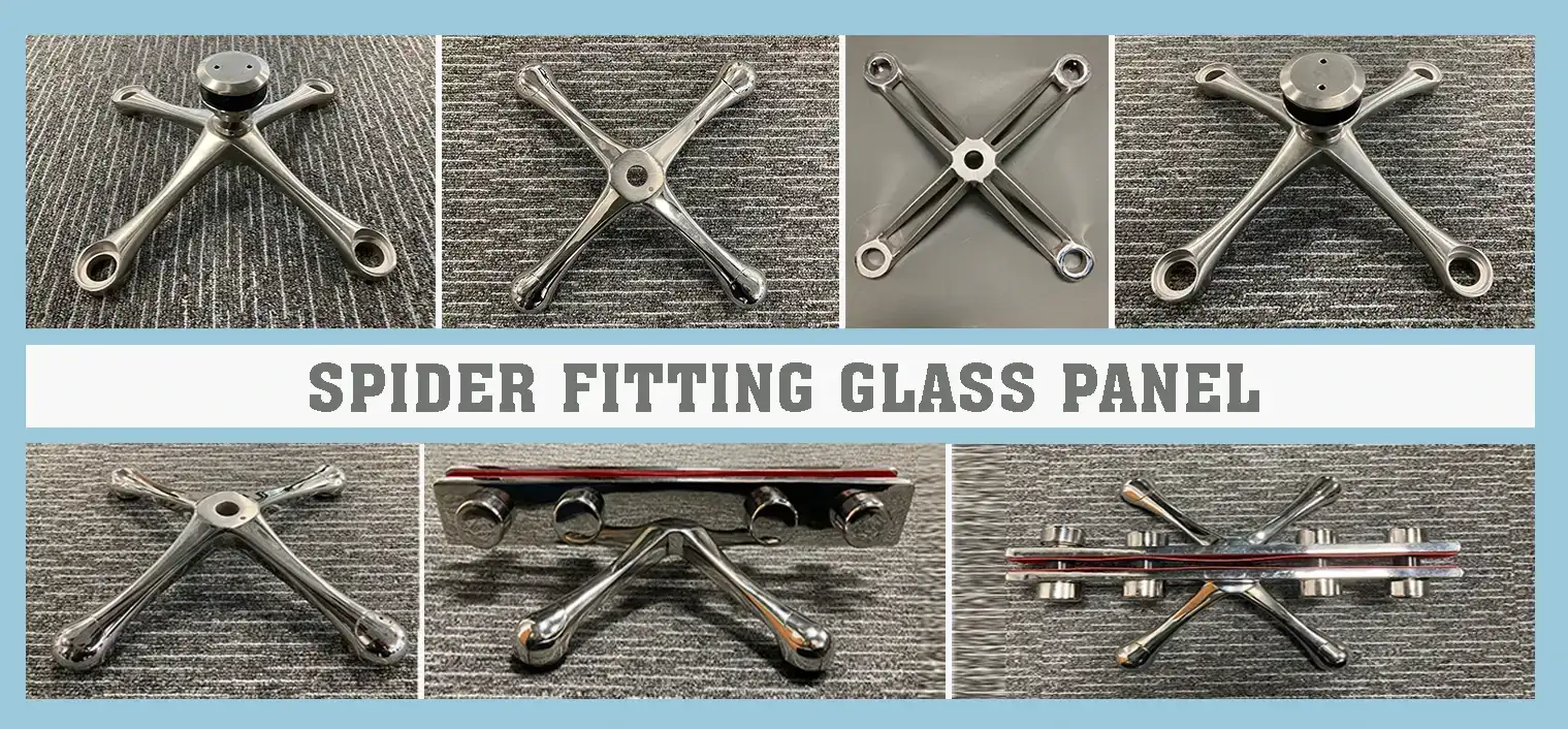 Bolt or spider glazing is glass held by 3-armed or 4-armed metal fixtures called spider fittings. There is no frame around the glass. The corners of the glass are pinched and held between metal fixtures called bolts or spider fittings.